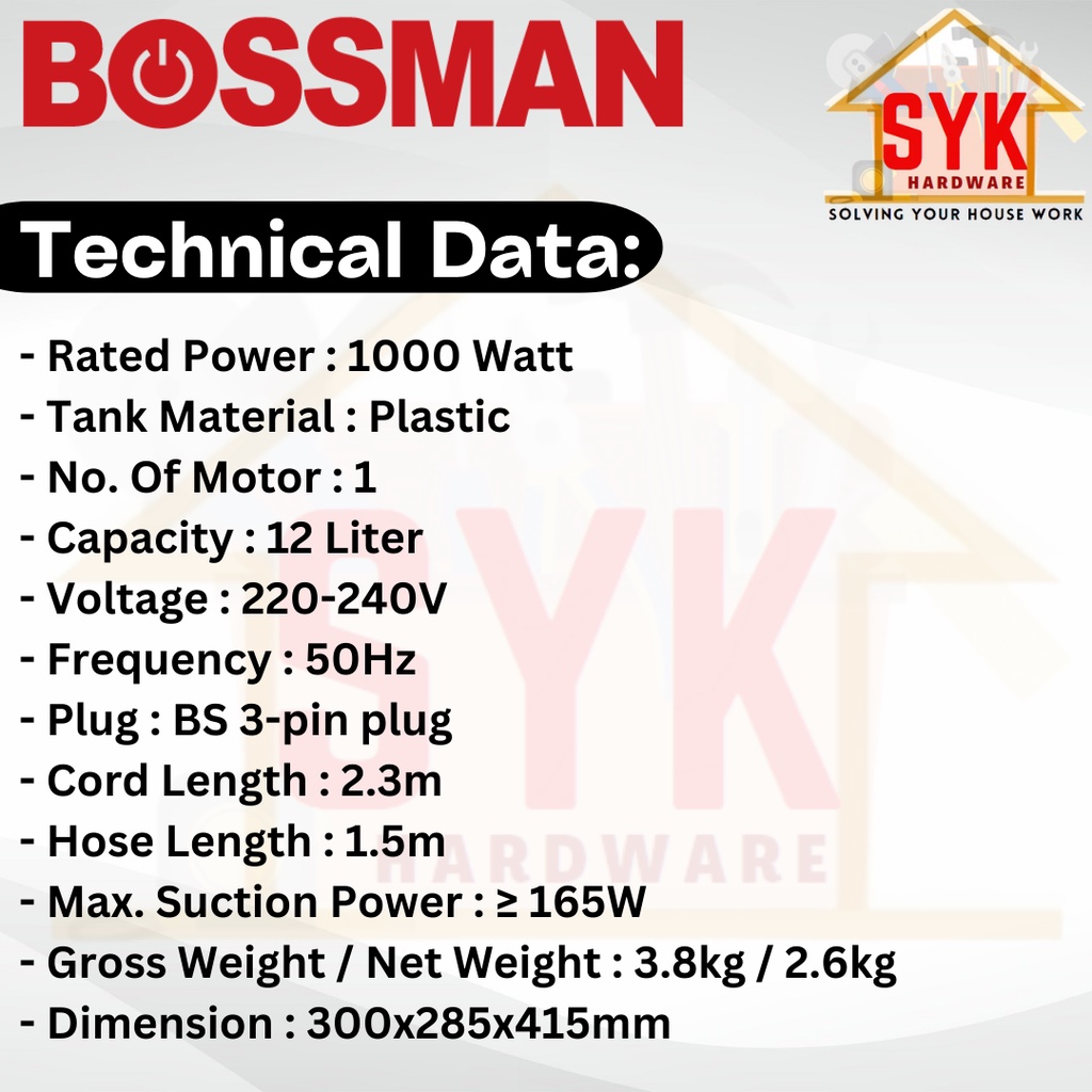 Product Specification about BOSSMAN BWD-12L1 Wet & Dry Vacuum Cleaner